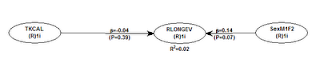 All of the results reported here are from analyses conducted using WarpPLS. Below is a model with coefficients of association; it is a simple model, since the hypothesis that we are testing is also simple. (Click on it to enlarge. Use the "CRTL" and "+" keys to zoom in, and CRTL" and "-" to zoom out.) The arrows explore associations between variables, which are shown within ovals. The meaning of each variable is the following: TKCAL = total calorie intake per day; RLONGEV = ratio of longevity; SexM1F2 = sex, with 1 assigned to males and 2 to females.